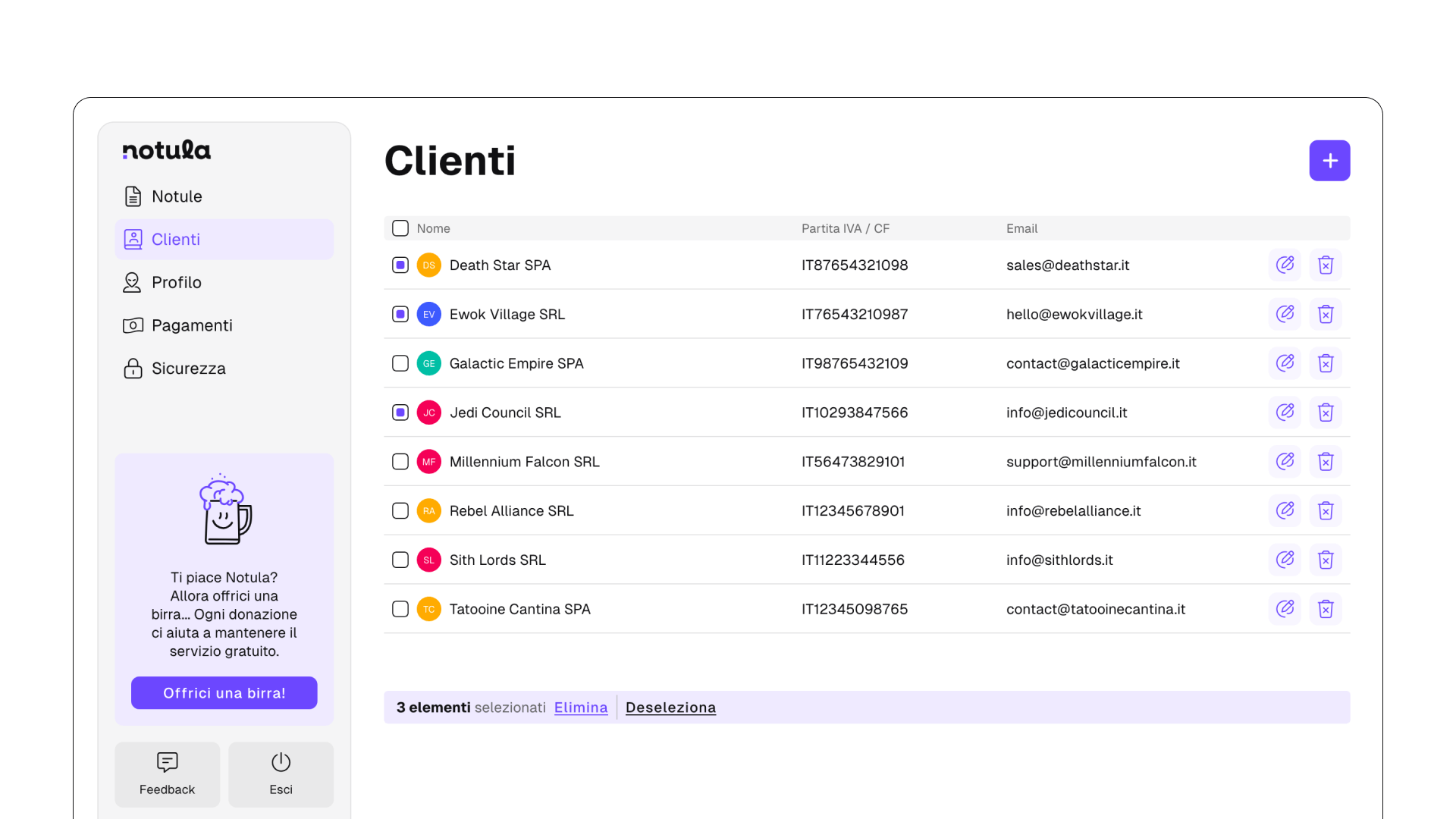 Partite IVA, indirizzi, codici fiscali... tutti i dati dei tuoi clienti sempre a portata di click. Niente più «dove cavolo ho messo la partita IVA di Rossi?»