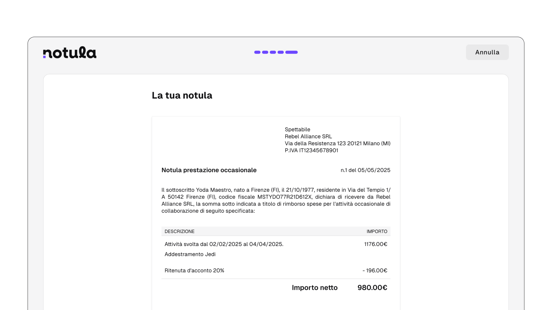 Crea e gestisci le tue notule di prestazione occasionale in pochi click. Gratis, semplice, senza rotture di c@#$%