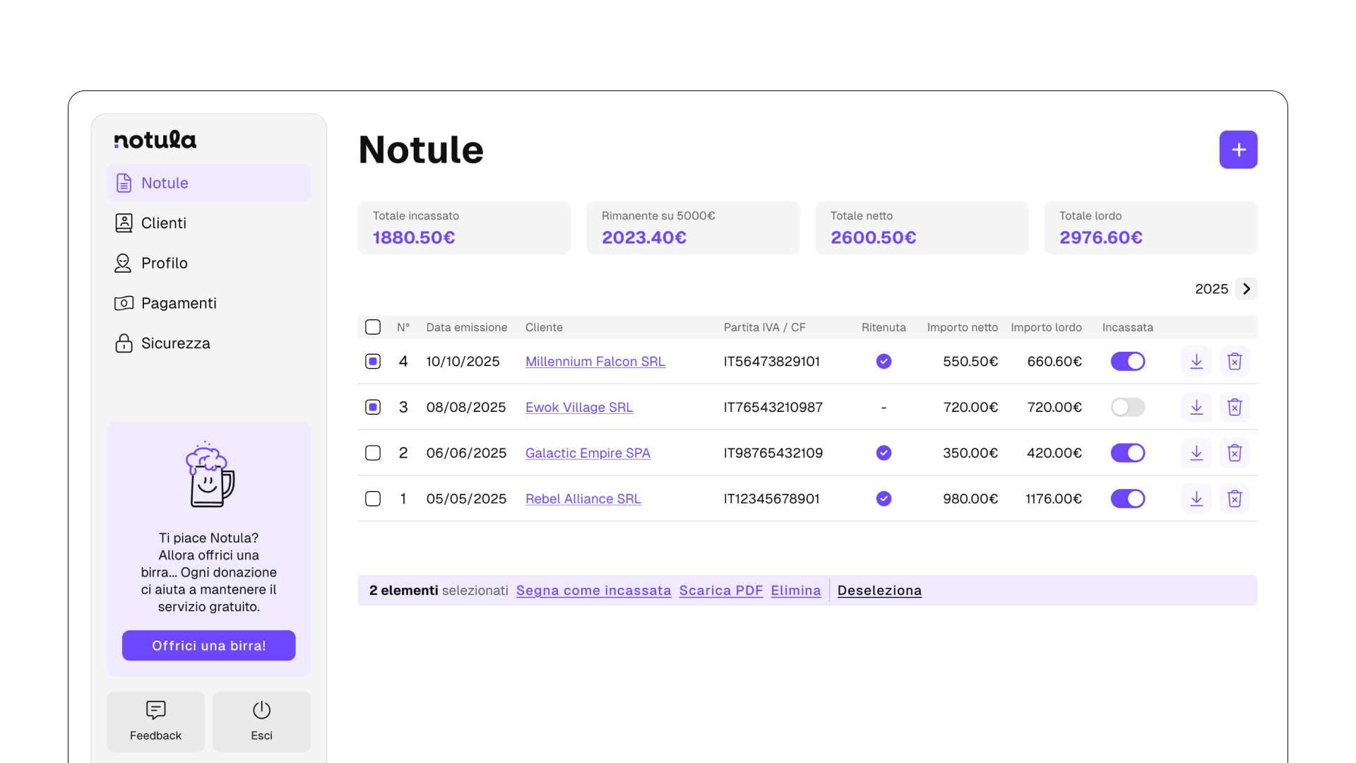 Basta perdere il conto! Tieni traccia di tutte le tue notule con numerazione automatica, importi e date sempre sotto controllo. Niente più «ma a quale numero ero arrivato?» o «quando cavolo l'ho mandata questa?»